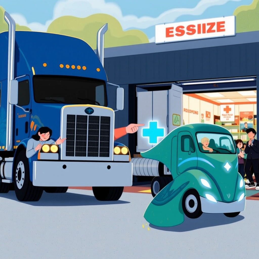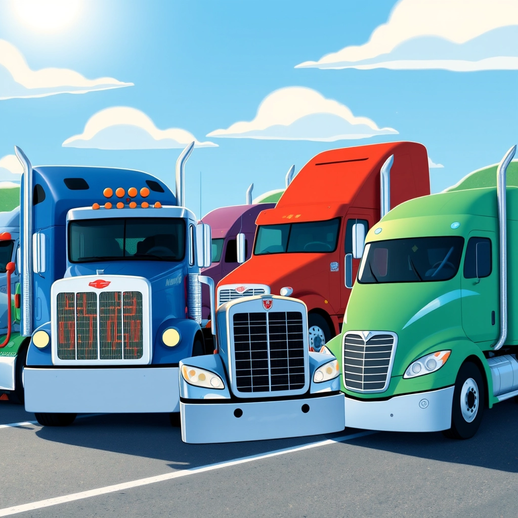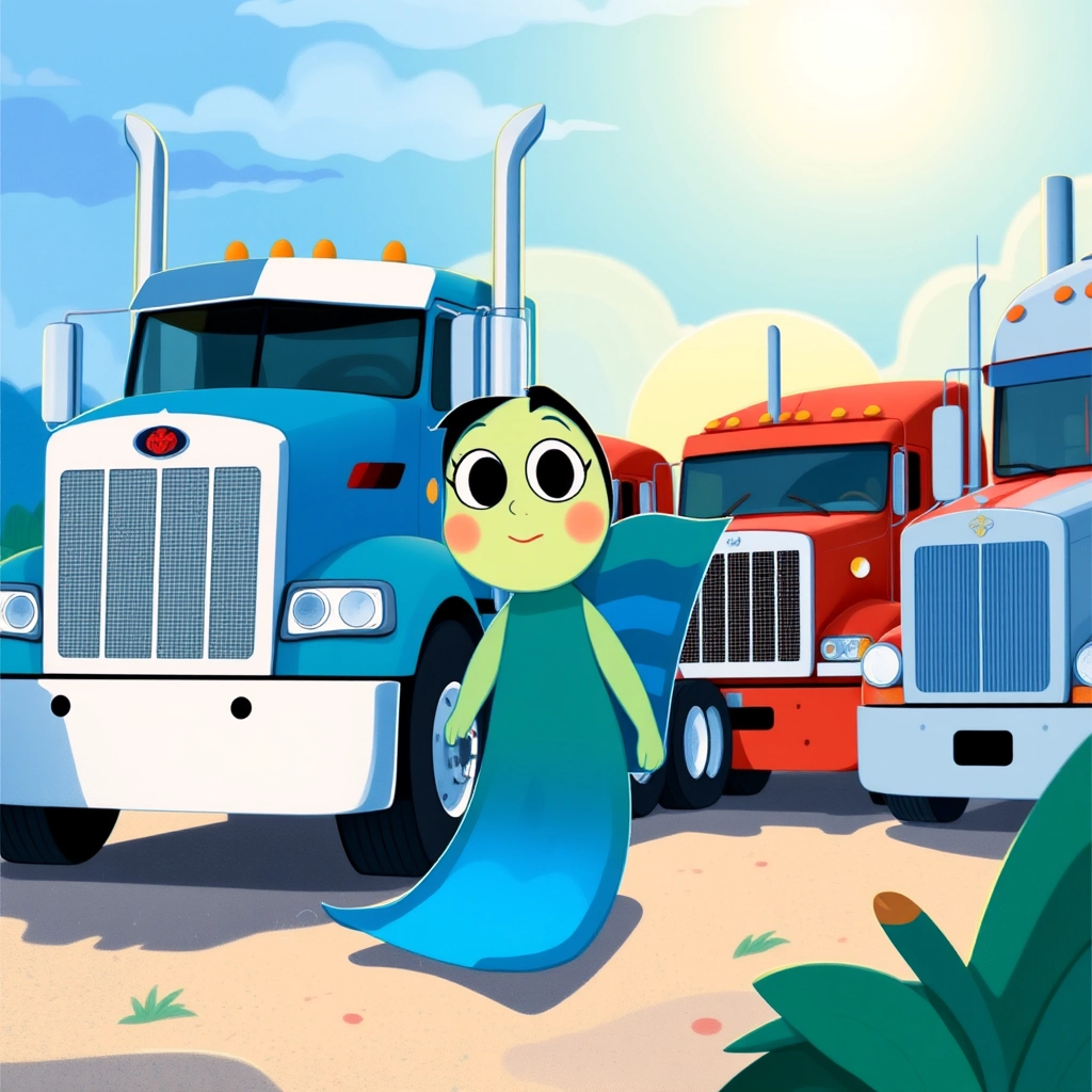It was a bright and sunny morning at the Sparkling Stop Truck Yard. [Benny](69LT5TJX) the Kenworth, [Pepper](S4GQ9B6P) the Peterbilt, and [Felix](L9P9W9GL) the Freightliner were busy chatting when a shiny new truck, [Ellie](V6WSFSN9) the Electric semi, rolled in, looking confused.