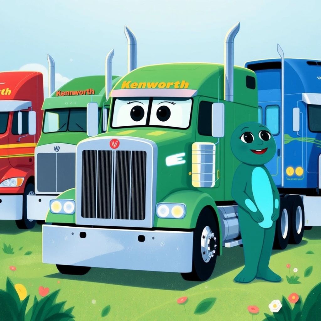 First, [Benny](69LT5TJX) the Kenworth said, "I haul heavy loads! Look at my strong chassis!" He flashed a confident smile as [Ellie](V6WSFSN9) inspected his sturdy frame. "My job takes me far across the country!"