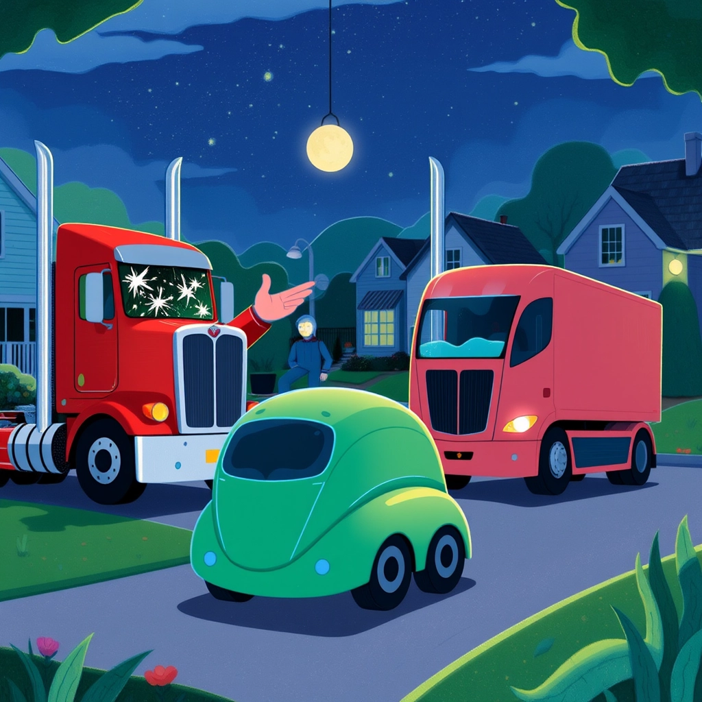 Then [Felix](L9P9W9GL) the Freightliner spoke up. "I usually carry lightweight and quick deliveries between towns. Speed is my specialty!" [Ellie](V6WSFSN9)’s lights twinkled with excitement. "You all sound amazing!" she said.