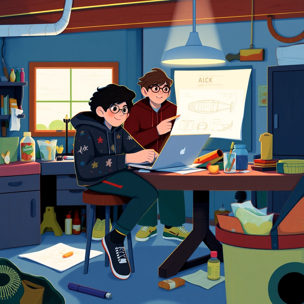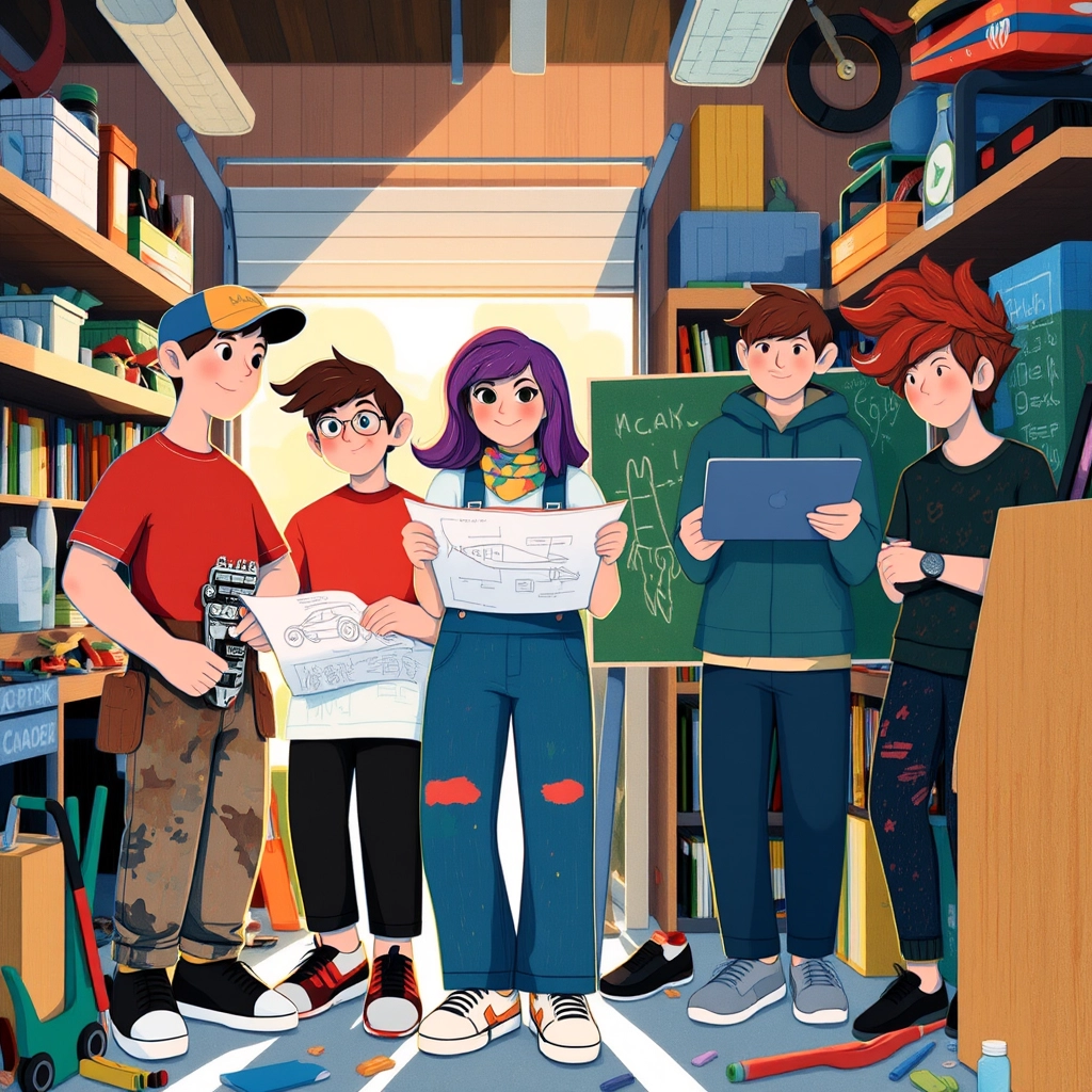 The friends transformed [Zoe](JKW2YKKT)'s dad's old garage into their headquarters. Piles of tools, car parts, and blueprints cluttered the space as they made plans. 'We need to think beyond ordinary cars,' said [Mia](JDVY9L4V), holding up a sketch of a rocket-powered car.