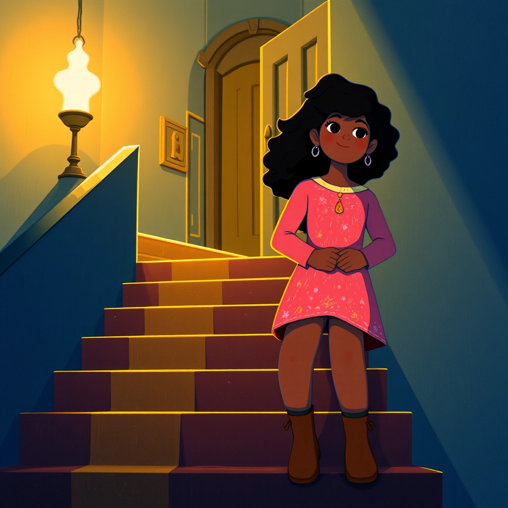 She reached out to touch the door, and as soon as her fingertips brushed the wood, it creaked open to reveal a shimmering, golden staircase leading down into darkness.