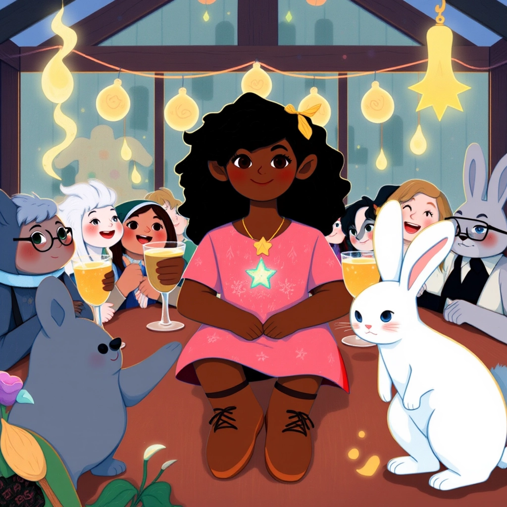 The animals celebrated [Tynilah](93JD5TGJ)’s bravery and kindness with a grand feast. [Theodore](ZL3PXTPD) gave her a special charm to remember her adventure by.