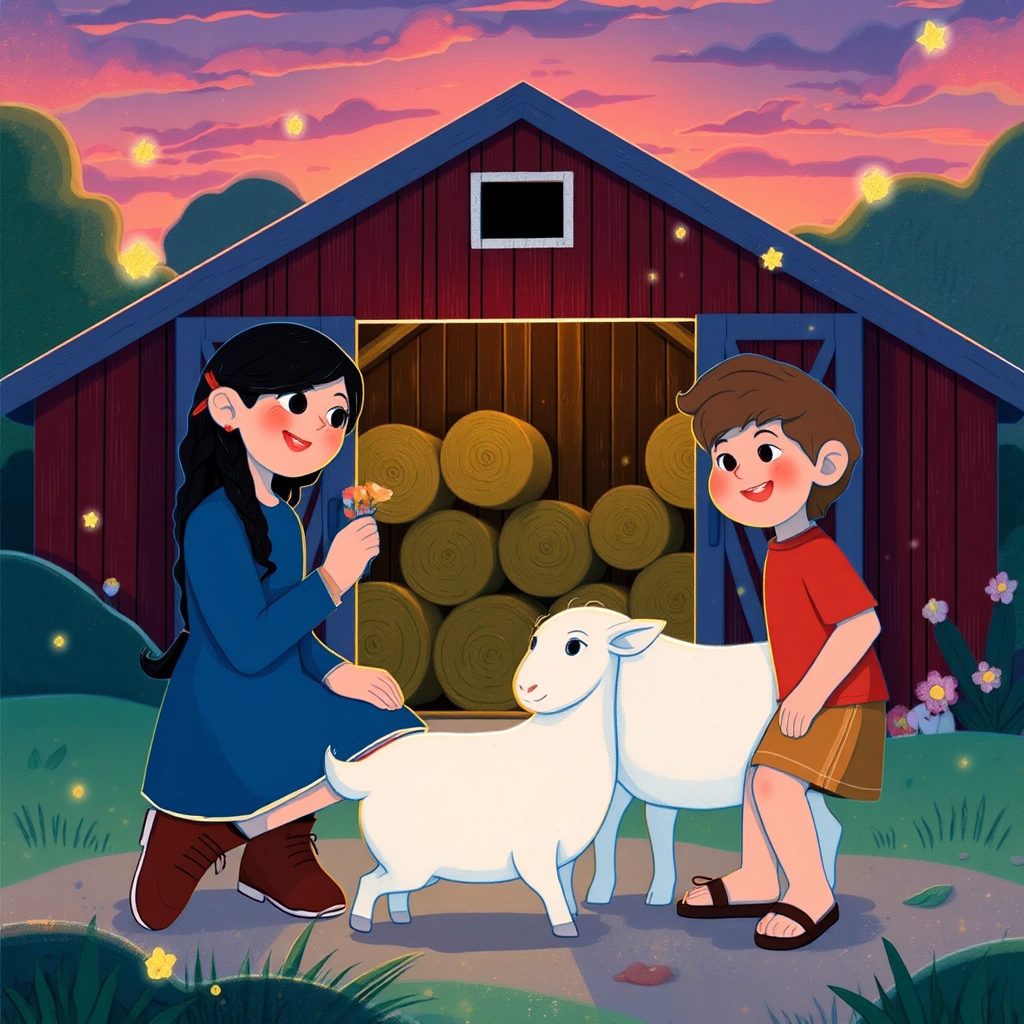 Depois do jantar, [Nina](JWBZC2M6) e [Pedrinho](KHNJDGJX) foram acariciar as ovelhinas fofinhas perto do celeiro.