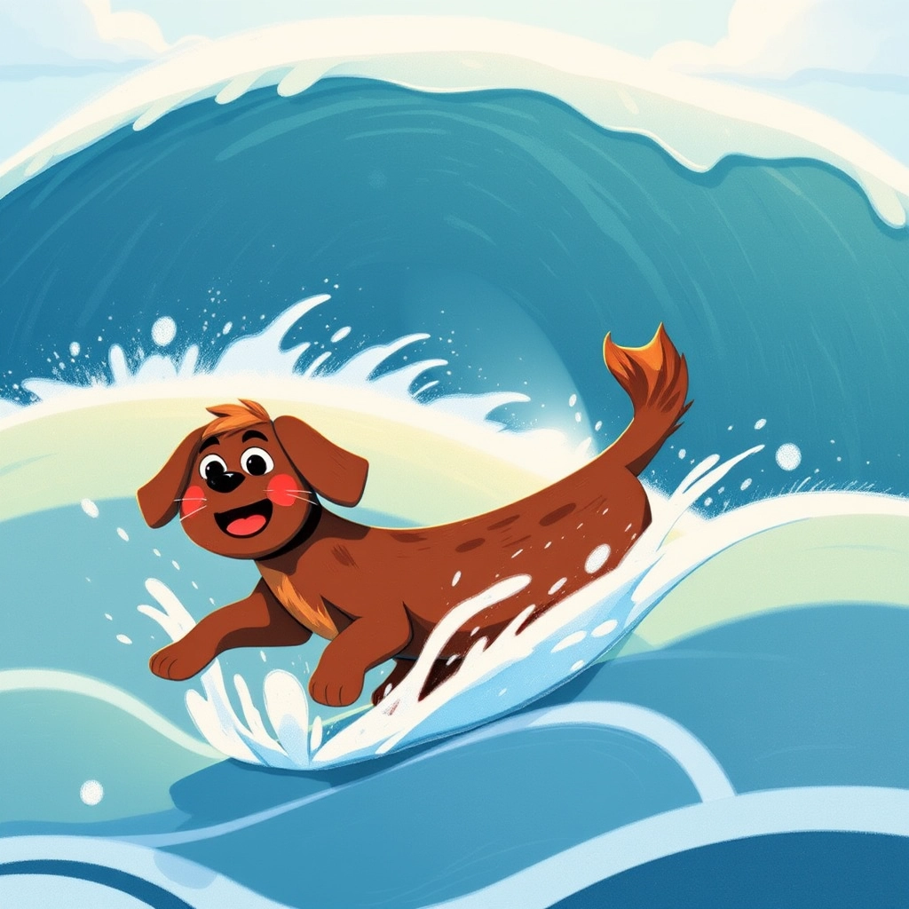 As [Valentino](5N2X2RS7) reached the water, a huge wave suddenly swept over him! Before he could bark for help, the wave pulled him into the ocean.