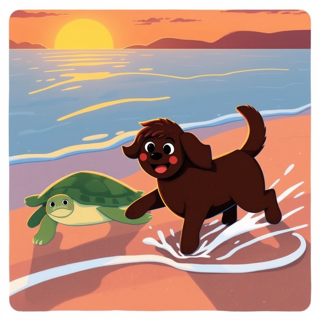 The turtle chuckled and said, 'You’re very brave, [Valentino](5N2X2RS7). Next time, let’s learn to swim together!' [Valentino](5N2X2RS7)’s tail wagged. He couldn’t wait to learn with his new friend!