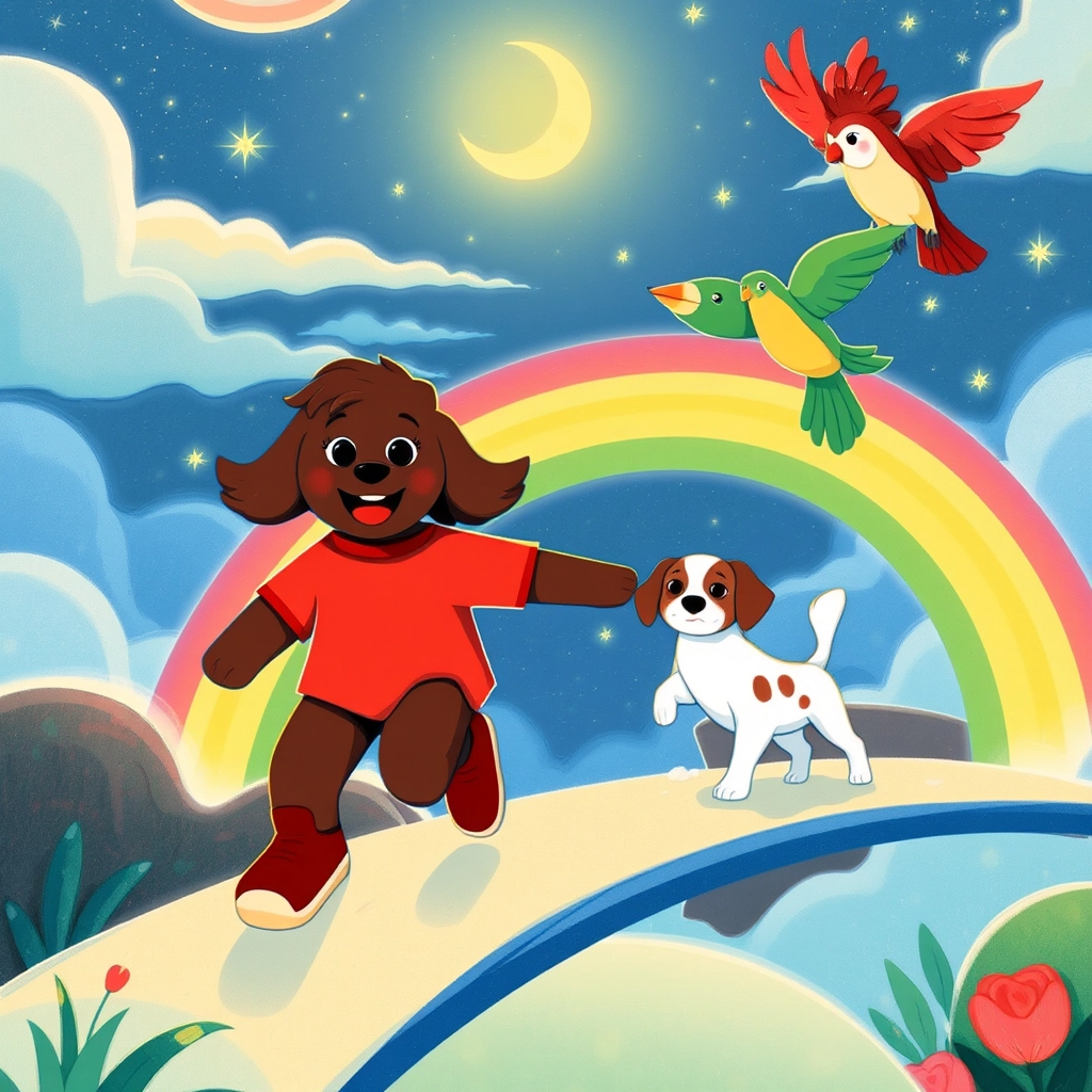 When [Valentino](5N2X2RS7) closed his eyes, he woke up in a place he didn’t recognize. But oh, was it beautiful! There were soft pastel clouds everywhere, and a dazzling rainbow stretched out before him like a giant bridge. [Valentino](5N2X2RS7) felt happy, healthy, and free, as if he could run and play forever.