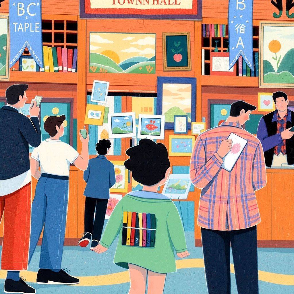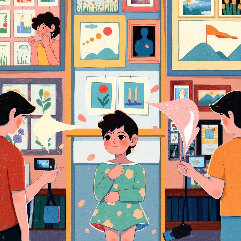 Gathering courage, [Vanshika](XQDHVYXX) walked up to the microphone. Her voice quivered as she spoke, 'I'm not really an artist. I used a printer to make these.' The crowd fell silent, and [Vanshika](XQDHVYXX)'s eyes filled with tears.