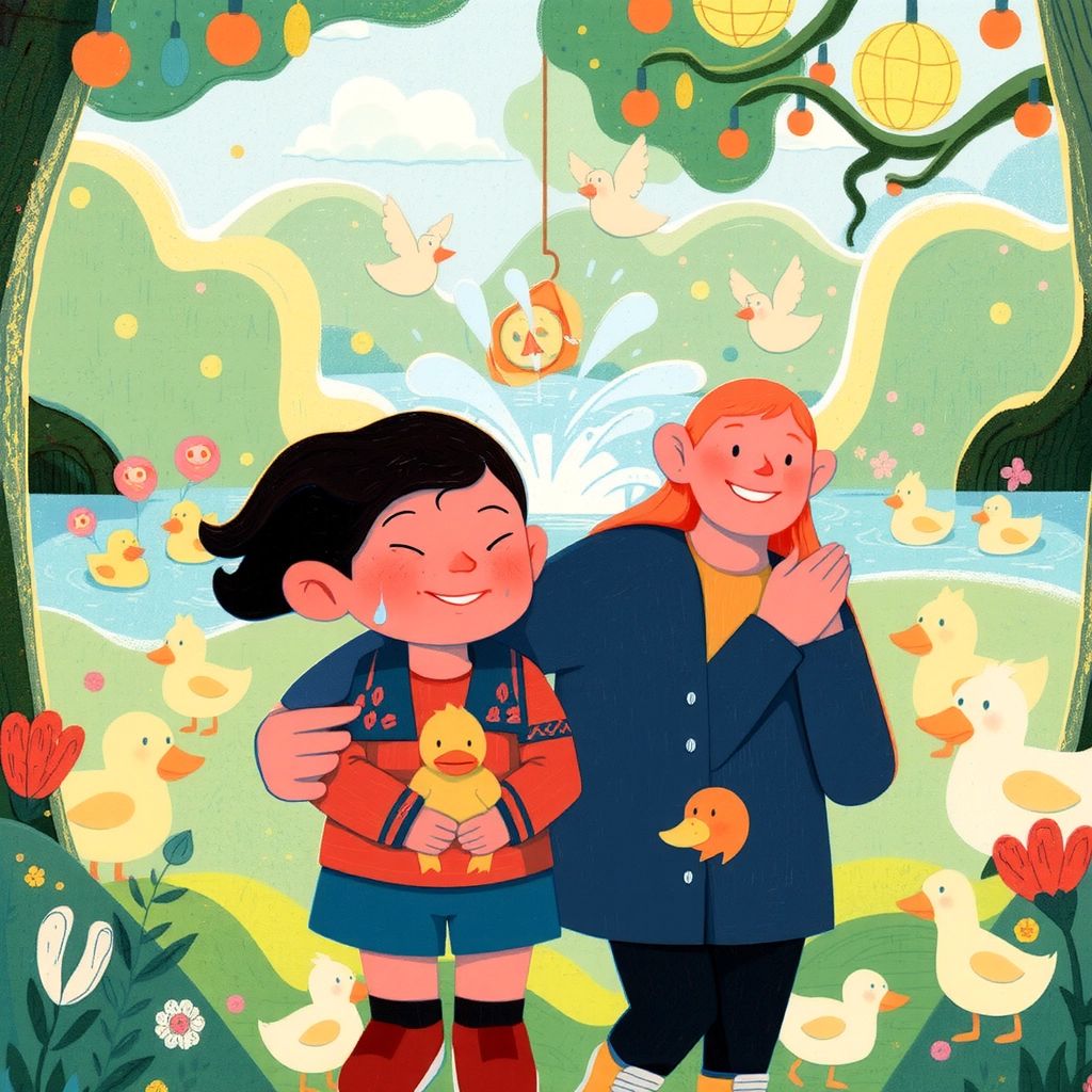 Next, they went to the village park, where [Meera](GTPHZGL2) pointed out the funny ducks. [Vanshika](XQDHVYXX) couldn't help but giggle as she watched the ducks waddle and quack. Could laughter be stronger than her tears?