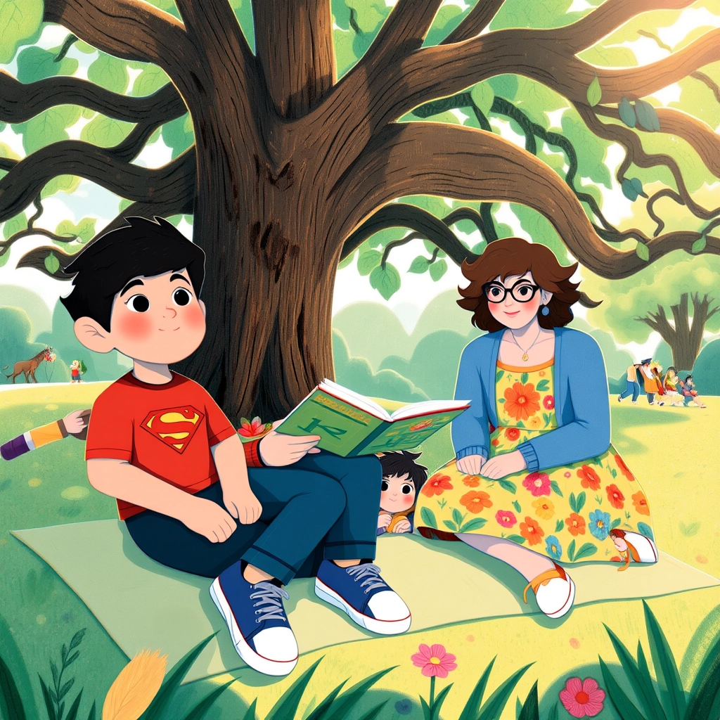 After painting, the group settled under a big shady tree for storytime. [Miss Angela](YQZYP3GR) read a story about a brave boy who never gave up, inspiring [Vartan](D4LWC9HM) to believe in himself.