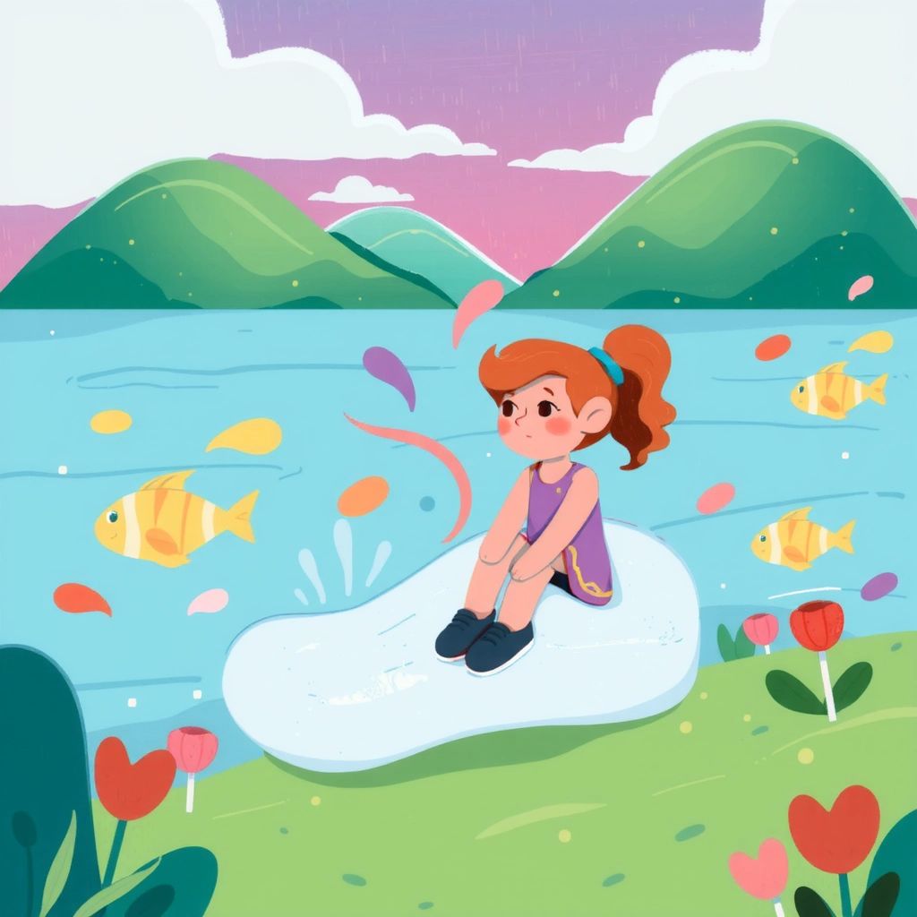 They arrived at the Lollipop Lake, where gumdrop fish jumped high, creating rainbow splashes. They sat on a marshmallow bench to enjoy the view.