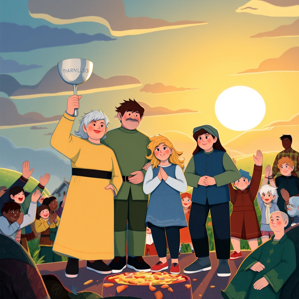 In the end, the Thorvaldsons won the silver ladle trophy! The village cheered as Phoenix used it to scoop some stew, spilling half of it on his Viking boots.