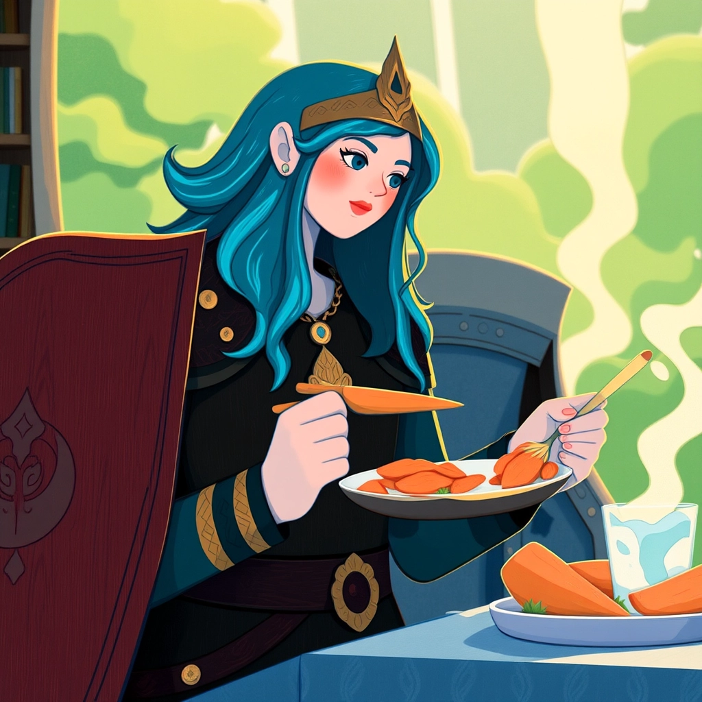 Shaerelle, the confident shieldmaiden, folded her arms while the aroma of honey-glazed carrots filled the air. Her wavy brown hair with electric blue streaks caught the winter sunlight.