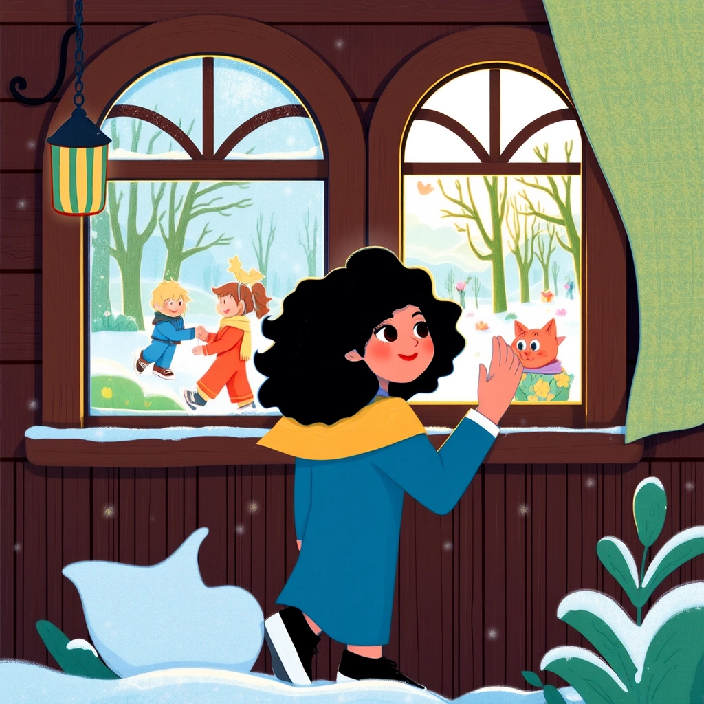 The next morning, [Zara](6YLQ7XSQ) peeked out her new frosty window. She could see children building snow forts in the park across the street. Suddenly, a girl with golden pigtails noticed her and waved. [Zara](6YLQ7XSQ) felt a little warmer inside and decided to go outside to explore.