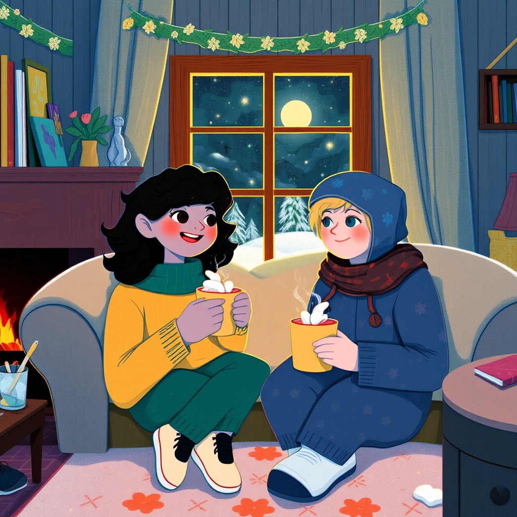 When the sun was setting, [Lily](RG62D329)’s mom invited [Zara](6YLQ7XSQ) and her parents over for hot chocolate. [Zara](6YLQ7XSQ)’s cheeks flushed pink from the cold, and her heart warmed with joy. She realized there was something magical about how the snow sparkled under the moonlight.