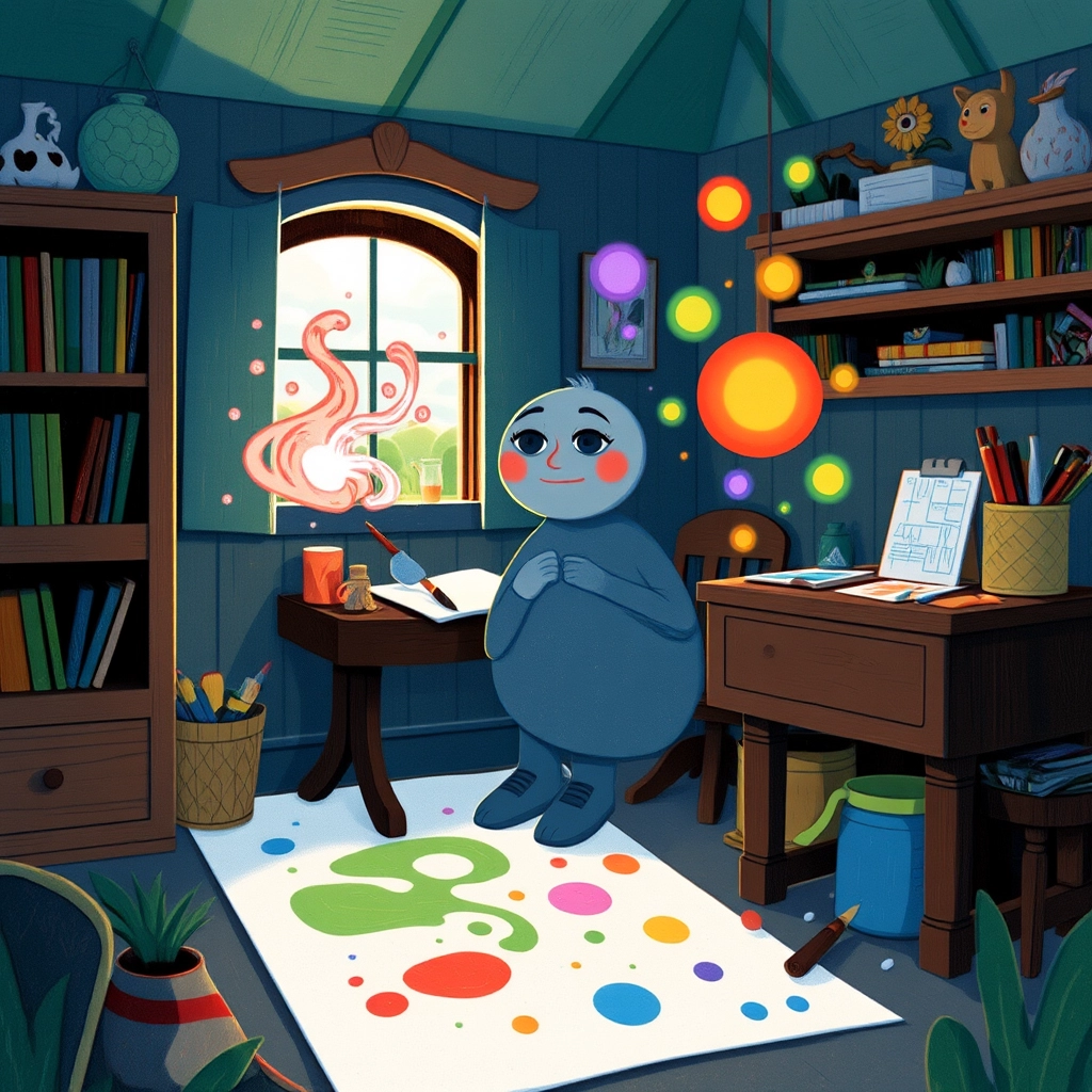 Then, [Speck](WB23K4VF) turned to painting a colorful scene, with swirls of blue, yellow, and green. But oh dear, her spots still glowed flaming red, and tears of frustration rolled down her head.