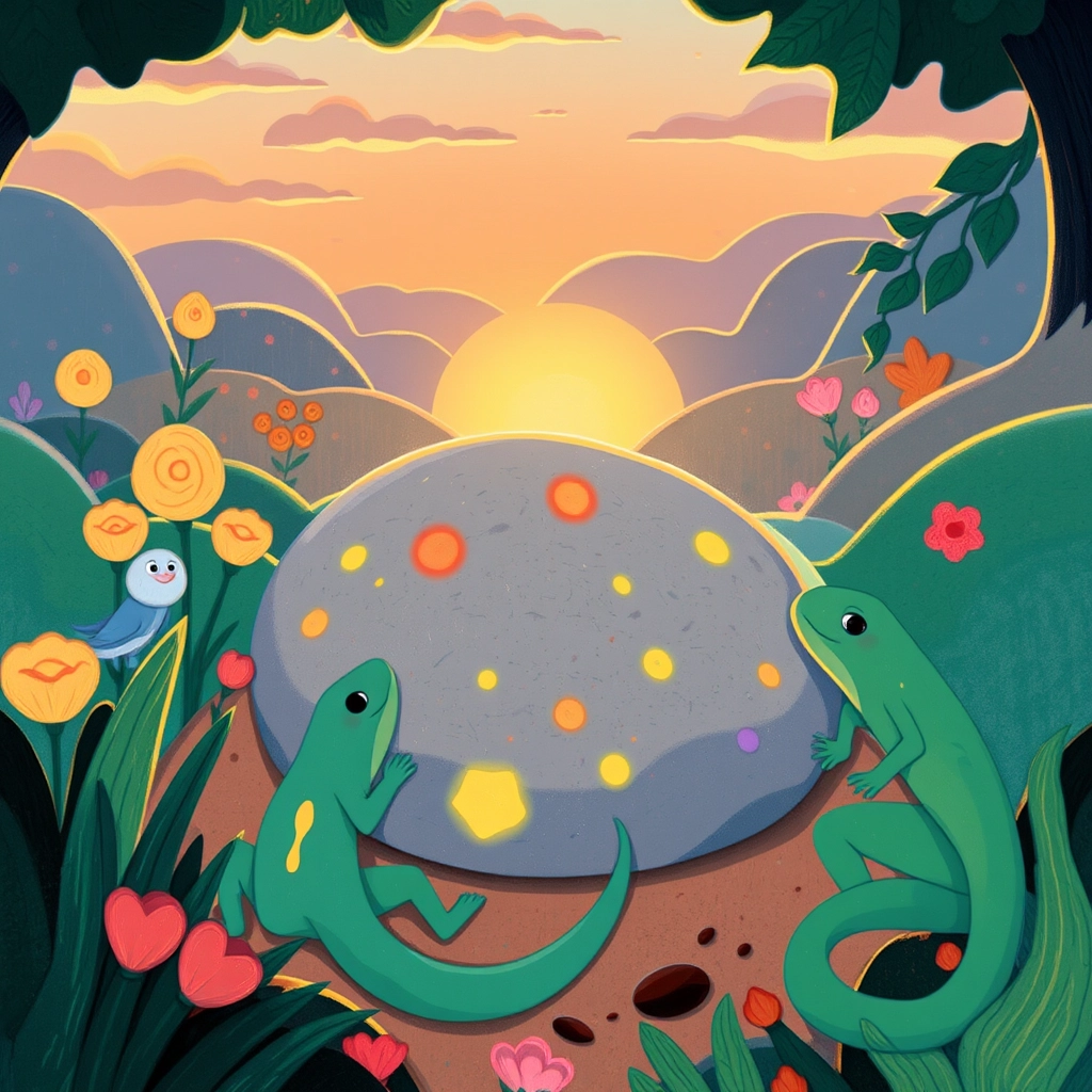 Her pet lizards, [Rusty](6MP2T769) and [Liz](VC9QSRLH), crawled close, snuggling up near her cute pebble toes. She patted their heads, taking a deep breath, and slowly her spots faded red to soft grey in depth.