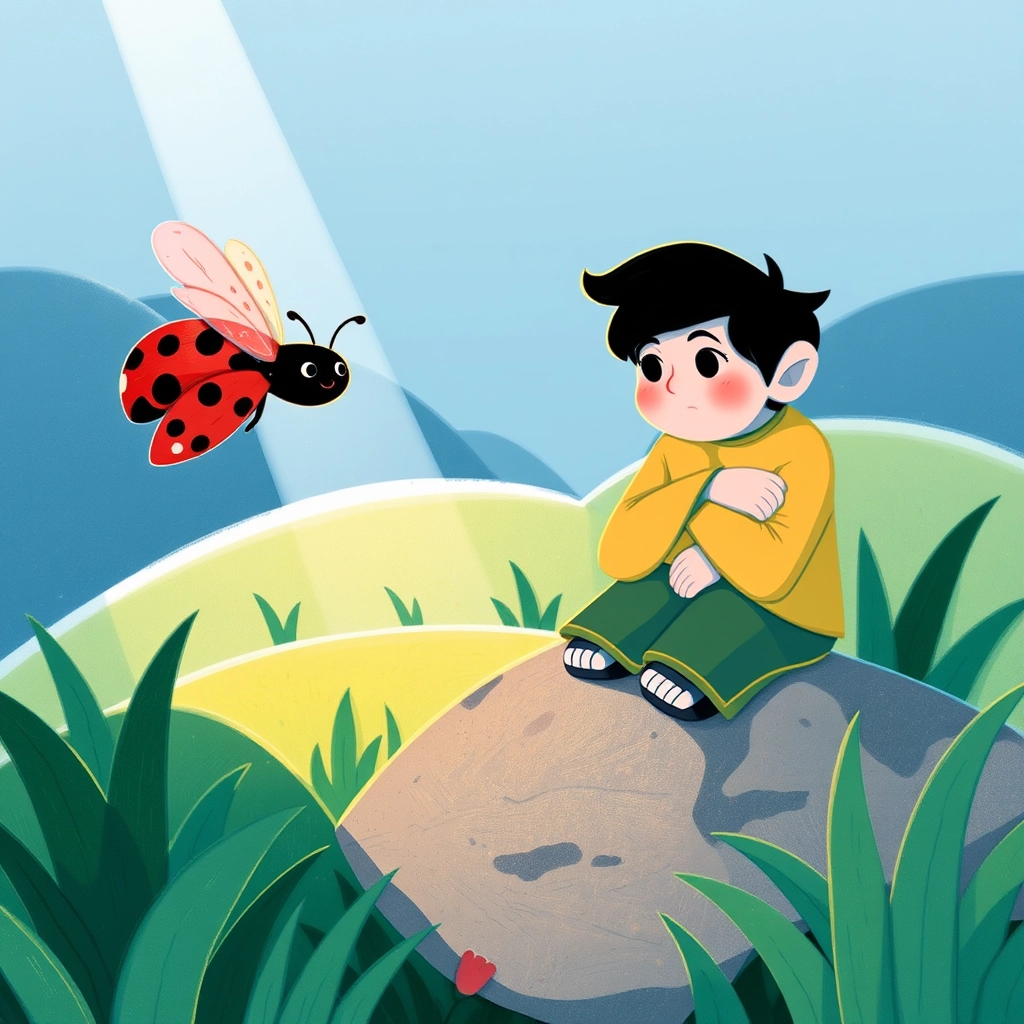 Benny felt sad. 'How can I make honey without flowers?' he wondered. He sat on a rock, deep in thought, until a friendly ladybug named Lily appeared.