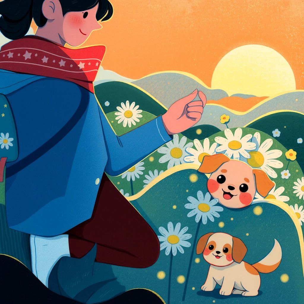 In the meadow, [星](KX4CJL52) heard a soft whimper. Behind a cluster of daisies, there was the lost puppy, wagging his tail excitedly to see someone at last!