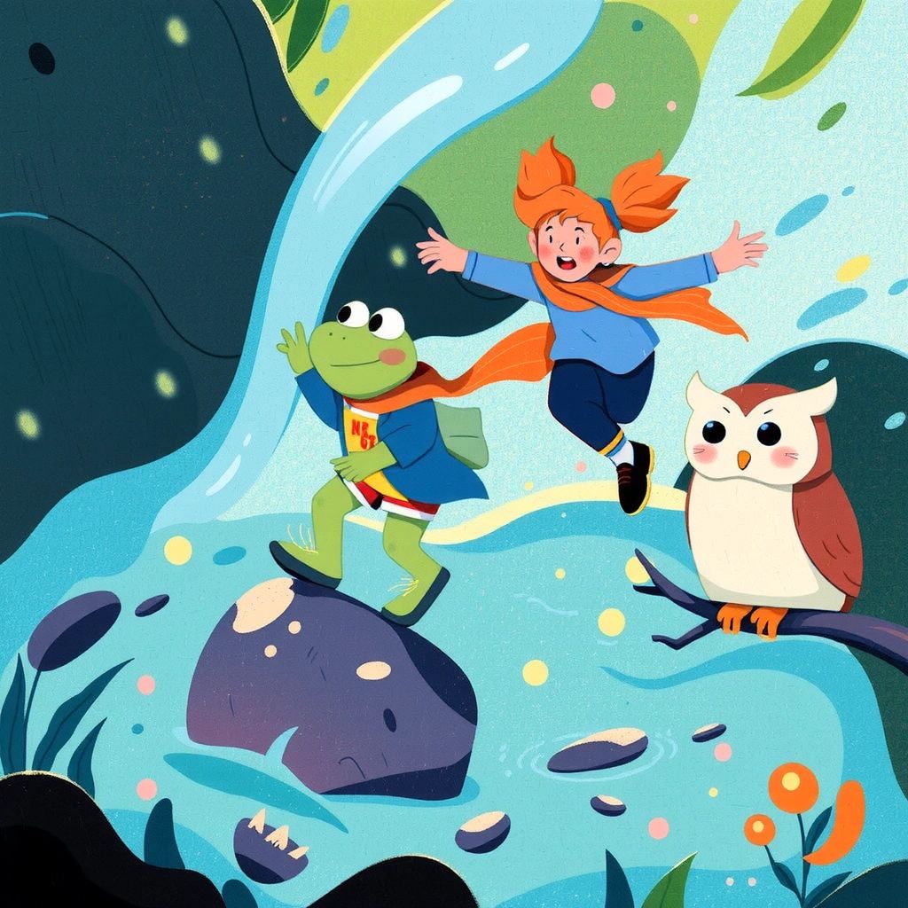 Thanking [Mr. Owl](MRG3JTTY), [星](KX4CJL52) continued her journey. At the Singing Creek, she met a lively frog named Bop who offered to guide her across the wobbly stones.