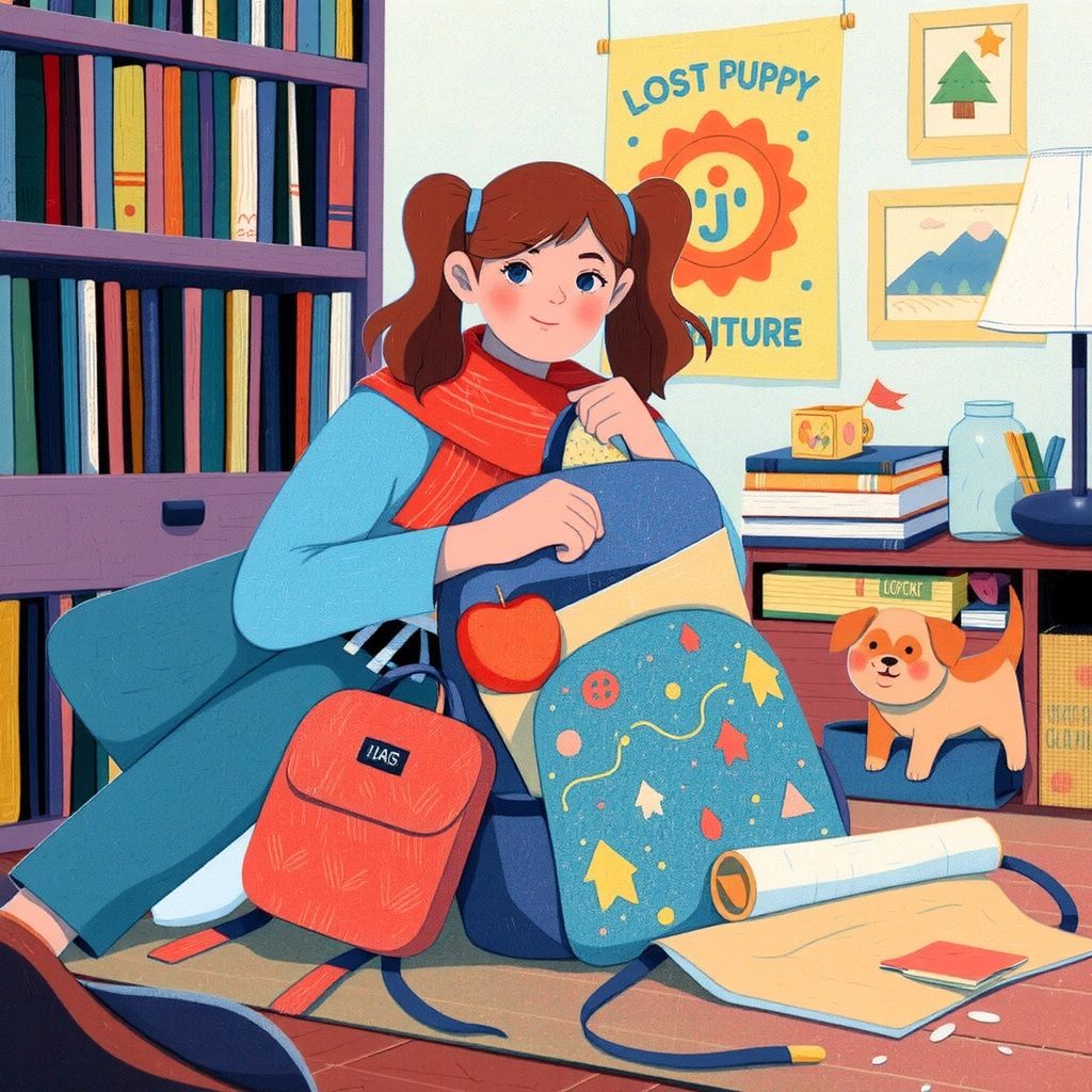Determined to find the lost puppy, [星](KX4CJL52) packed a small backpack with snacks and a map. She waved goodbye and set out on her journey.