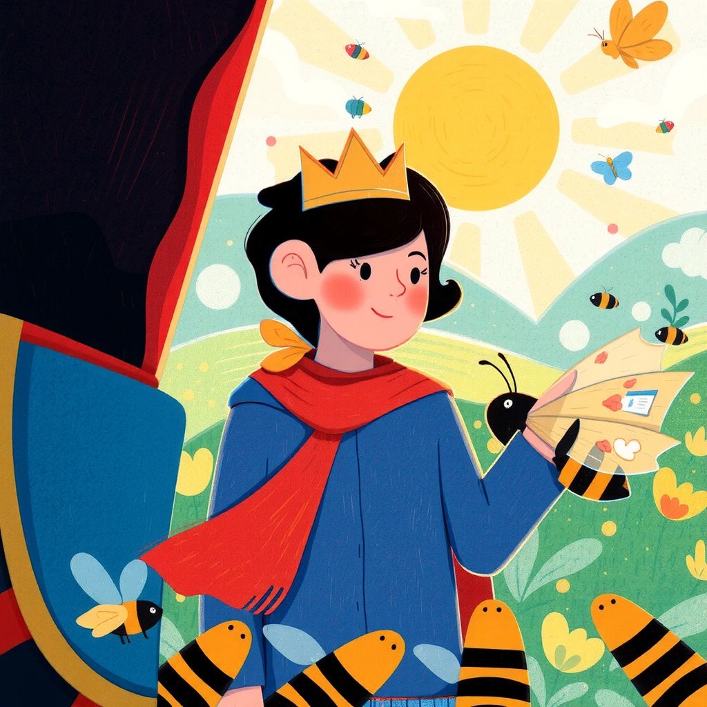 After the work was done, the [Queen Bee](D6ML9D73) kindly pointed [星](KX4CJL52) in the right direction. Feeling grateful, [星](KX4CJL52) walked further along the path into a sunny meadow.