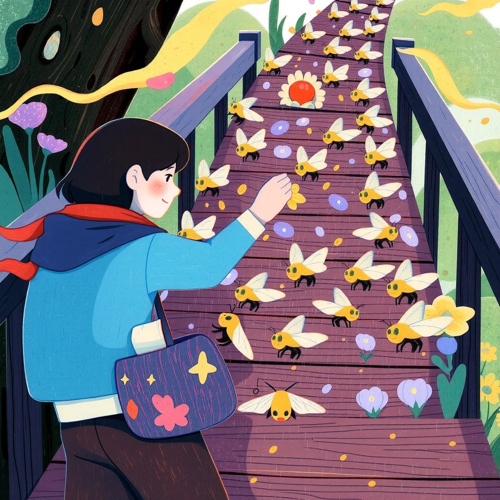 At Bumblebridge, a colony of busy bees were working. [星](KX4CJL52) admired their teamwork and learned about cooperation by helping them finish their honey harvest.