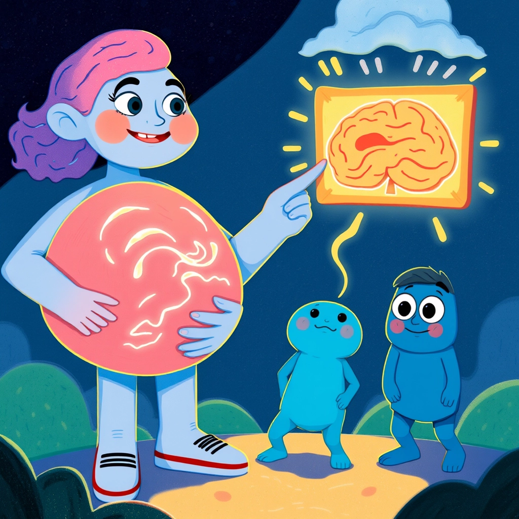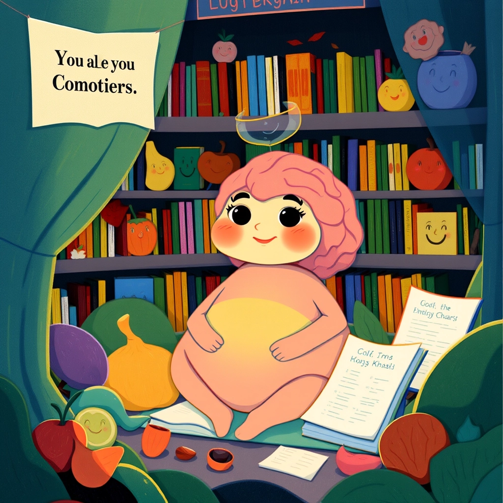 'I feel twisty in my tummy,' said [Nervy](FPN4NJZN), nervously fidgeting with his small hands. 'Oh!' said [Yummy Brain](7377F6MJ). 'That’s because your tummy is your second brain—it senses emotions too!'