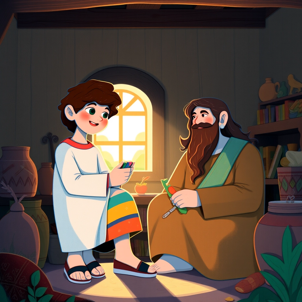 At his house, [Zacchaeus](R57BSMQR) nervously showed [Jesus](VG2SYFN7) his favorite toys. 'These are my treasures!' he said shyly.