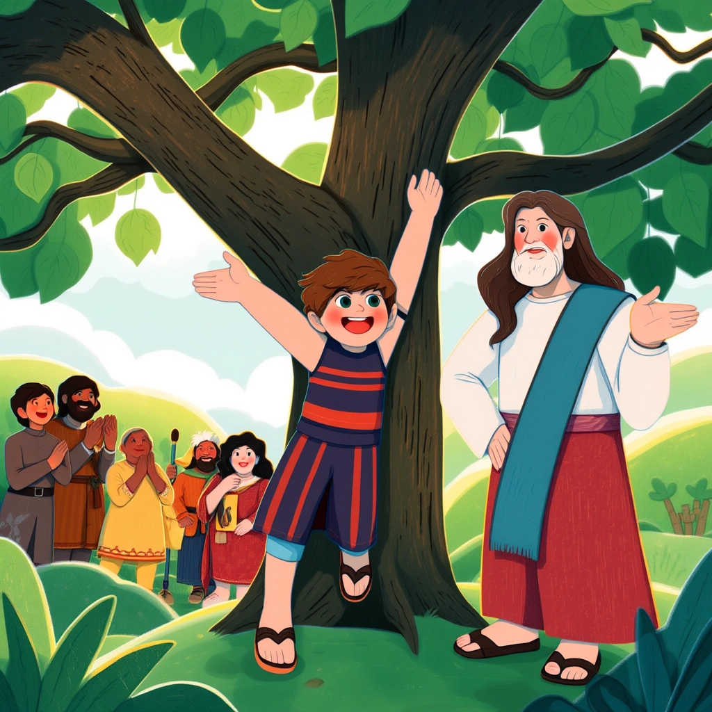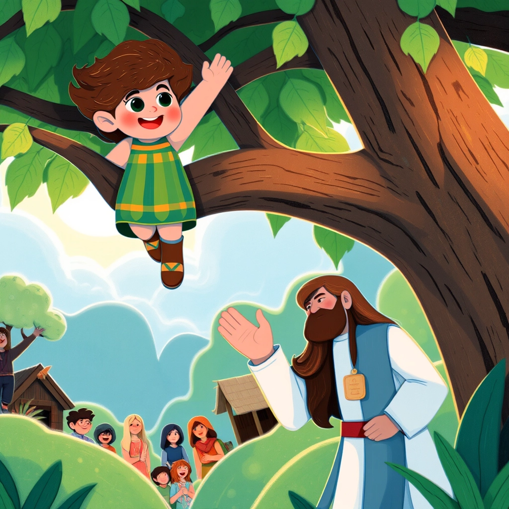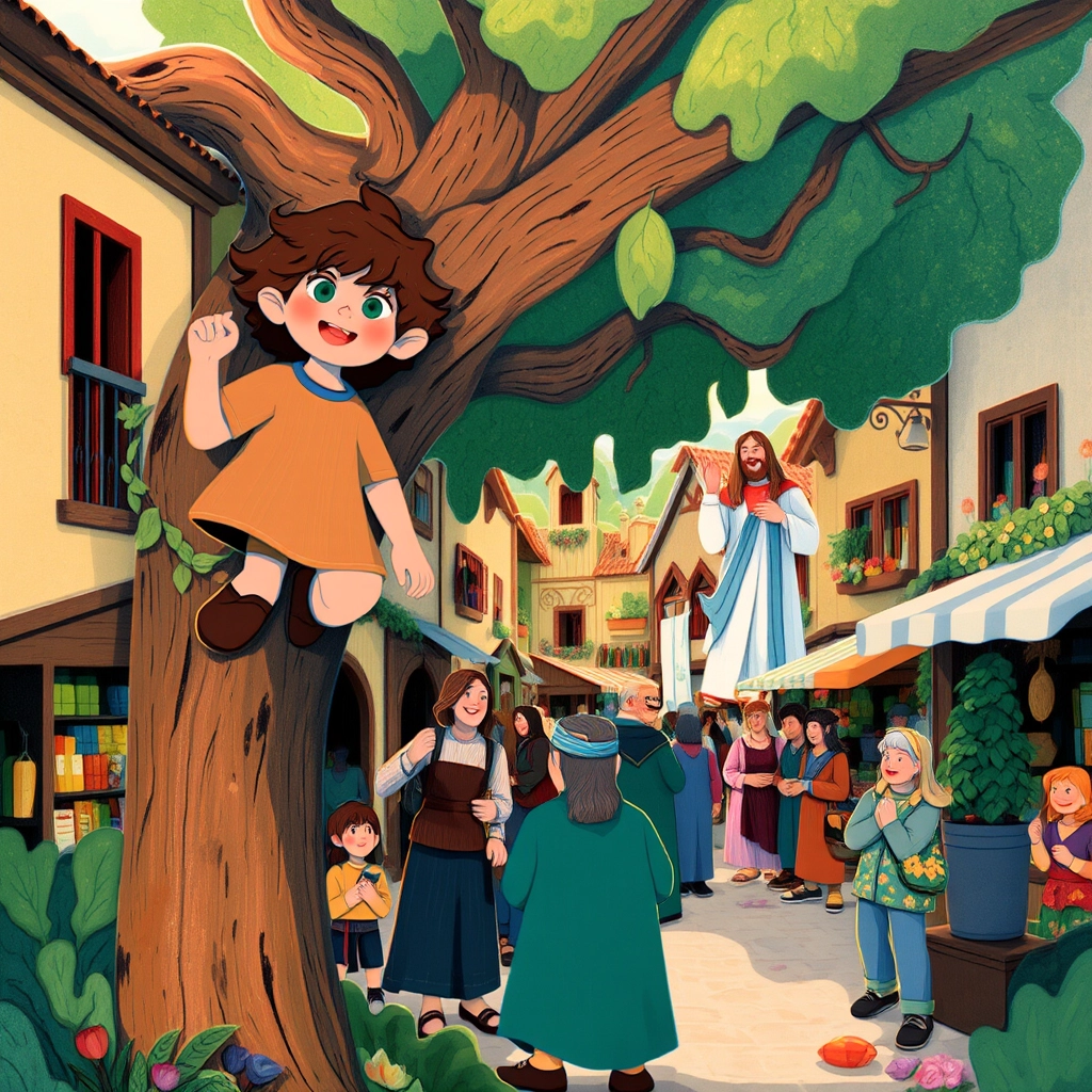 In a busy little town, young [Zacchaeus](R57BSMQR) loved climbing trees. One day, he heard excited whispers—[Jesus](VG2SYFN7) was coming to visit!