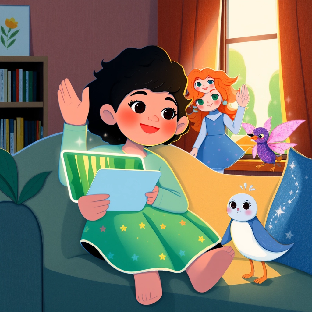 Back at home, [Zahra](S5VF99RX) waved to [Racheal](PDWYSH25) and [Pip](MZ3WZR4T) as the iPad shimmered again. 'Let’s play again soon!' [Zahra](S5VF99RX) said, smiling brightly.