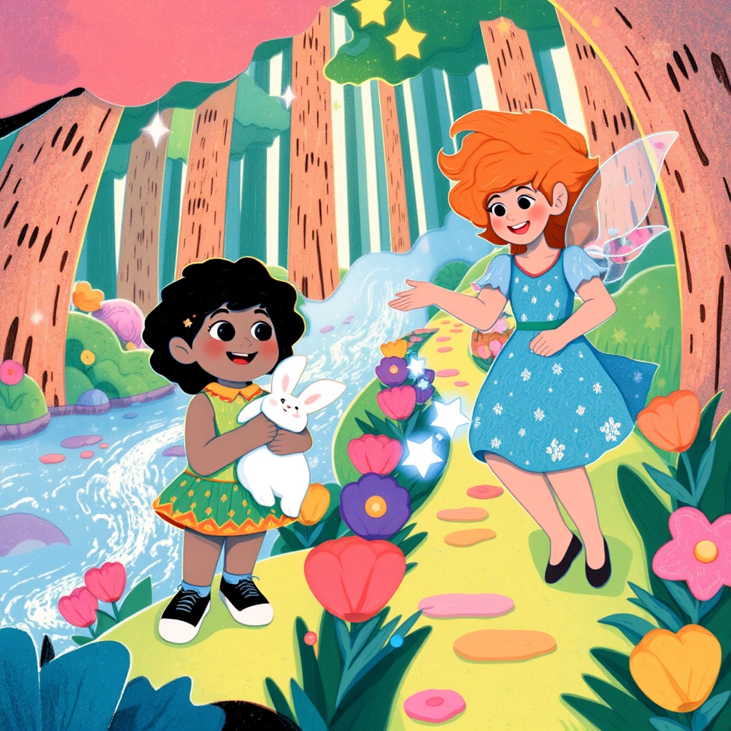 In a flash, they landed in a magical forest where trees had candy leaves and rivers sparkled like glitter. 'Wow!' [Zahra](S5VF99RX) exclaimed.
