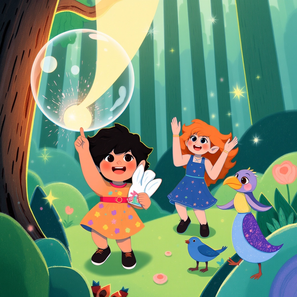 [Zahra](S5VF99RX) gently popped the biggest bubble, and out came a burst of laughter! The forest filled with happy giggles again.