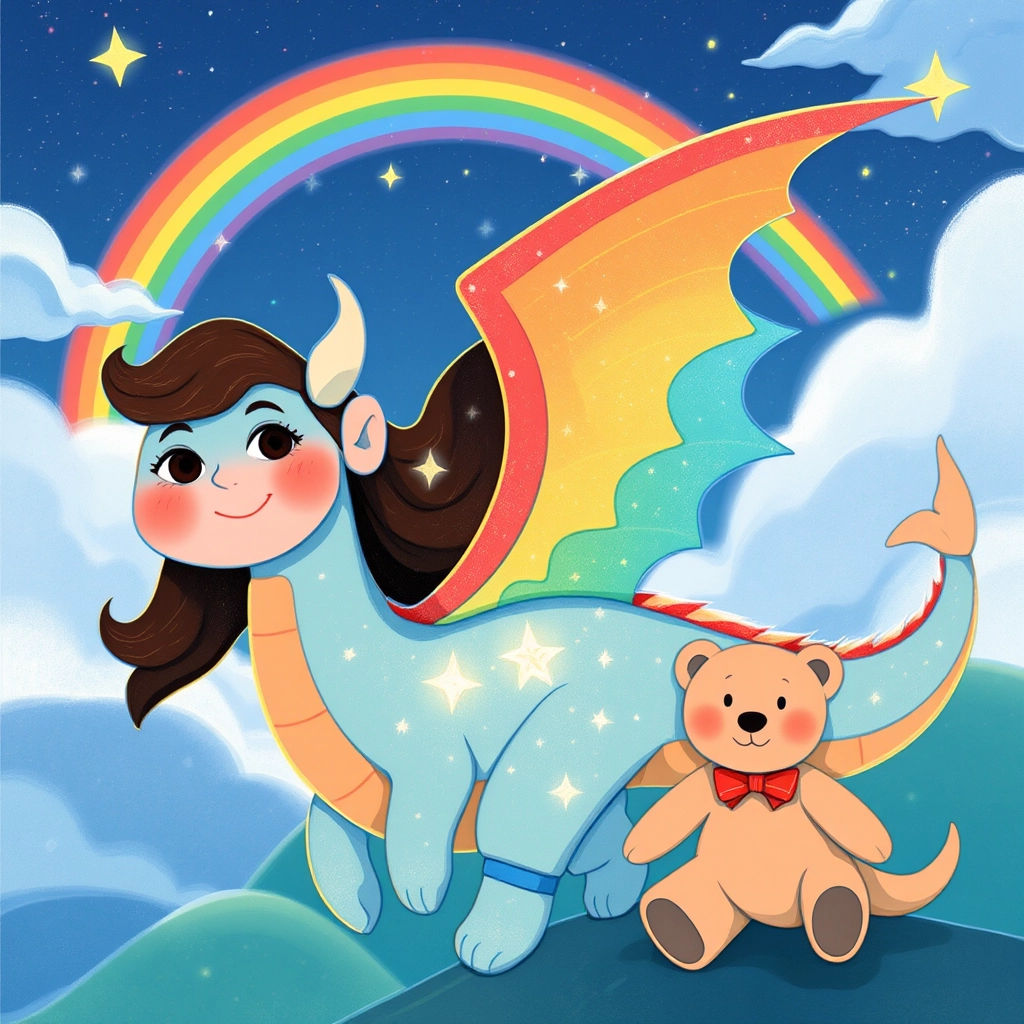 Suddenly, a glowing dragon with rainbow wings swooped down. But [Zara](CYCCVTH3) wasn’t scared! The dragon grinned and offered to take her on a ride.