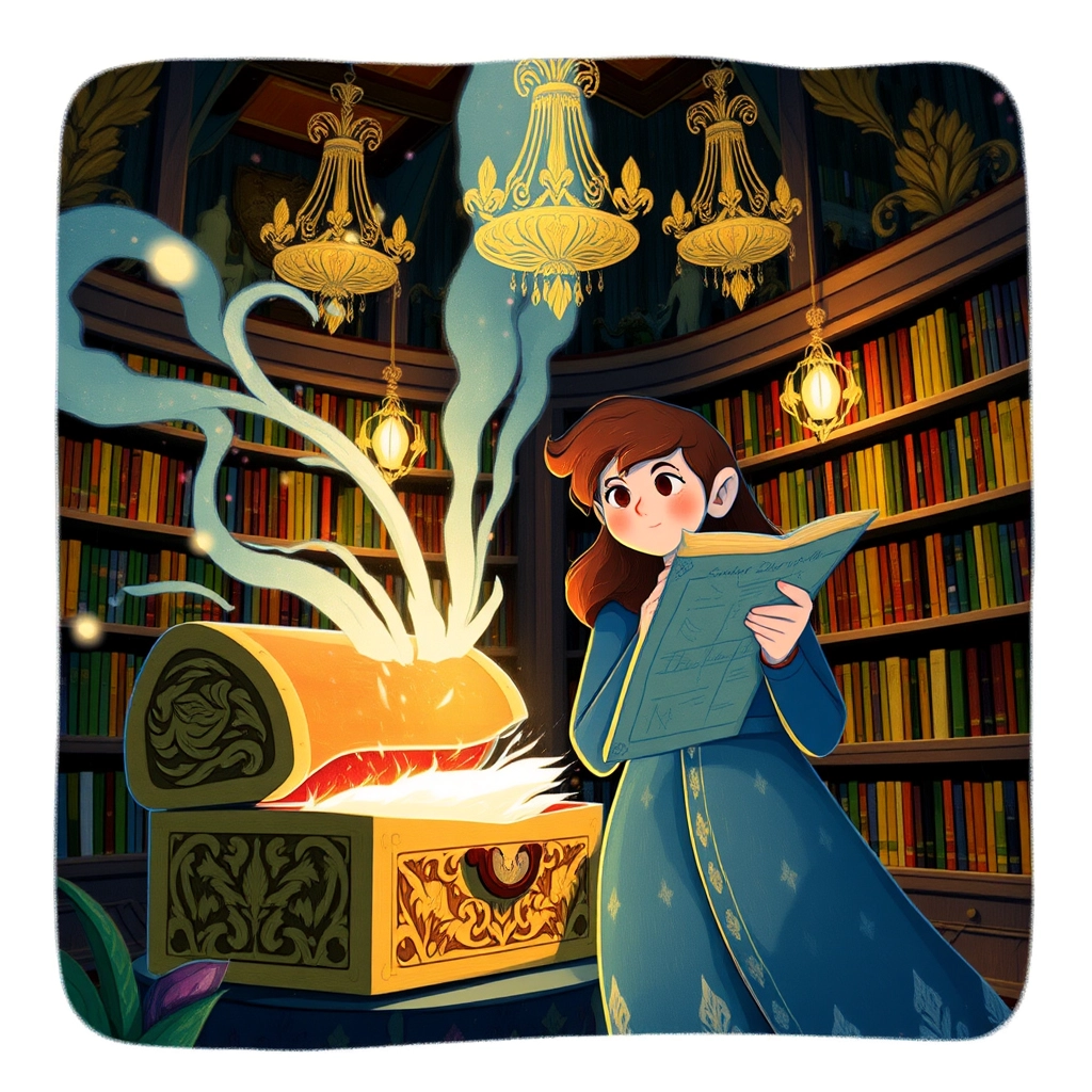 Zarah decided to explore the castle, beginning her search in the library. In the center of the enormous room, she spotted a mysterious golden chest that seemed to glow faintly. Could the key unlock it?