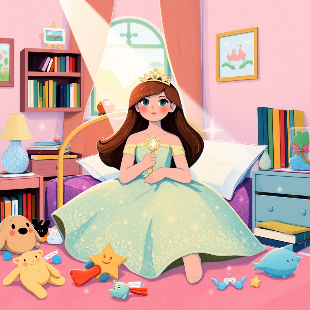 One sunny morning, Zarah found a sparkling golden key under her pillow. She was puzzled but excited. What could this key unlock? She wandered around her pink room, examining her belongings for hidden secrets.