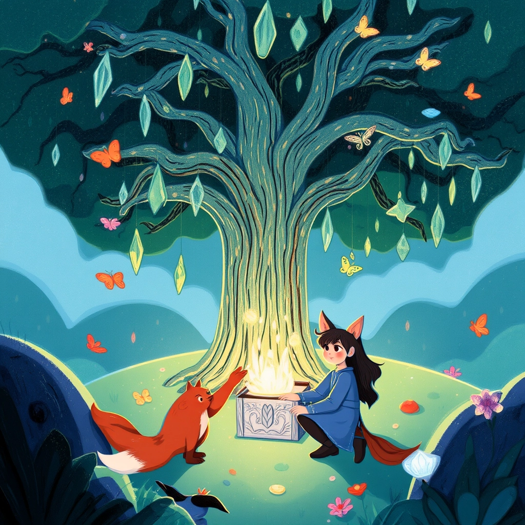 Reynard led Zarah to a clearing where a crystal tree stood. Beneath it was a small, shimmering chest. Inside, they found magical seeds that could grow any plant in an instant, bringing endless beauty and resources to her kingdom.