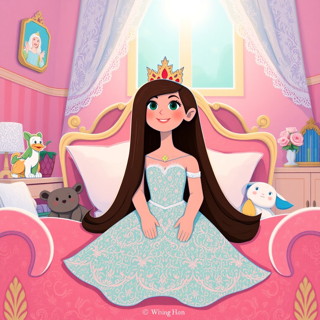Once upon a time in a faraway kingdom, [Princess Zarah](V9JZV4Q6) lived in a grand castle. Her most unique feature was her two different colored eyes—one green and the other blue. She had silky, flowing brown hair and a smile that could light up any room. Zarah’s enormous pink bedroom was her favorite place in the castle.