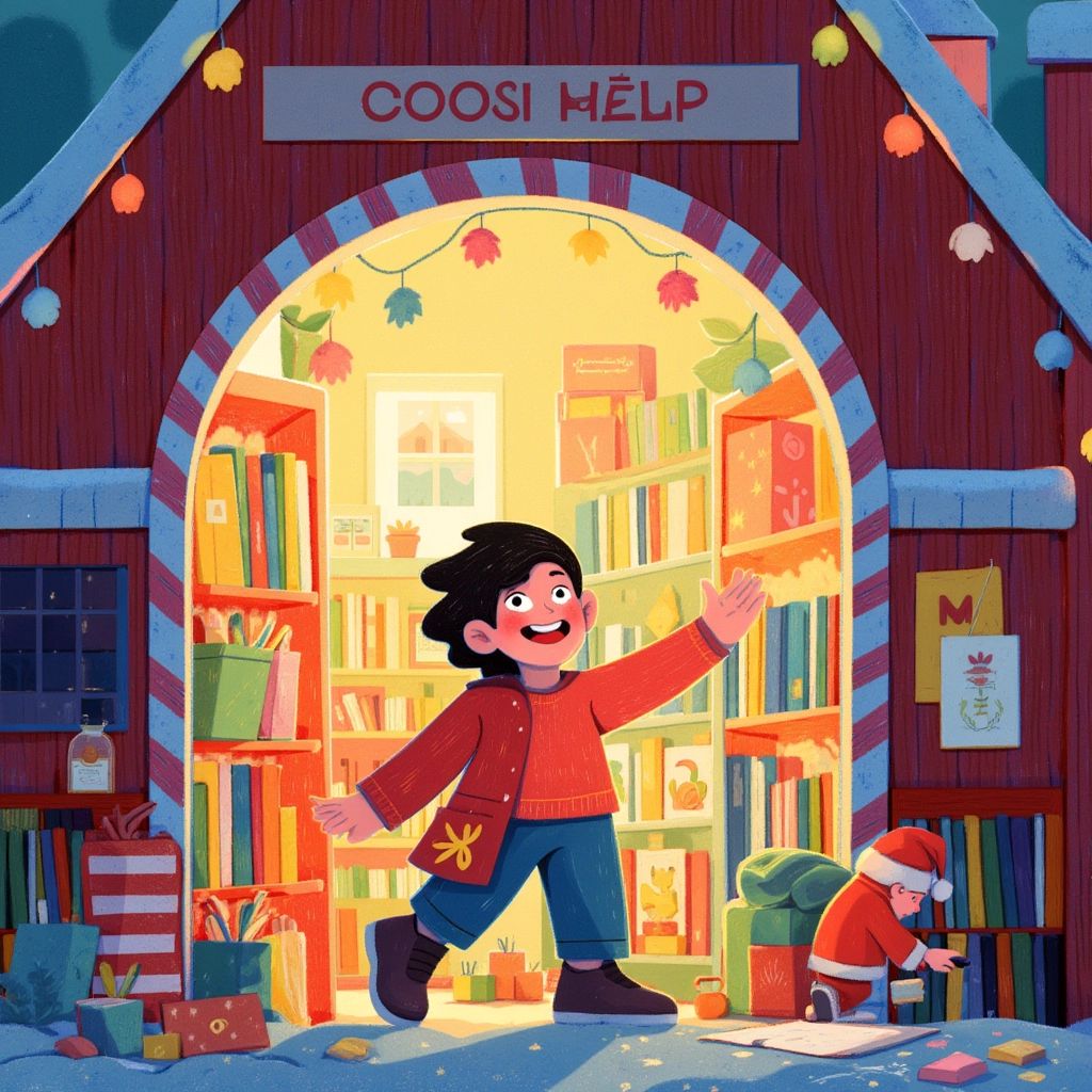 Soon, they landed near Santa’s workshop—a candy-cane decorated house bustling with elves wrapping gifts and crafting toys with care.