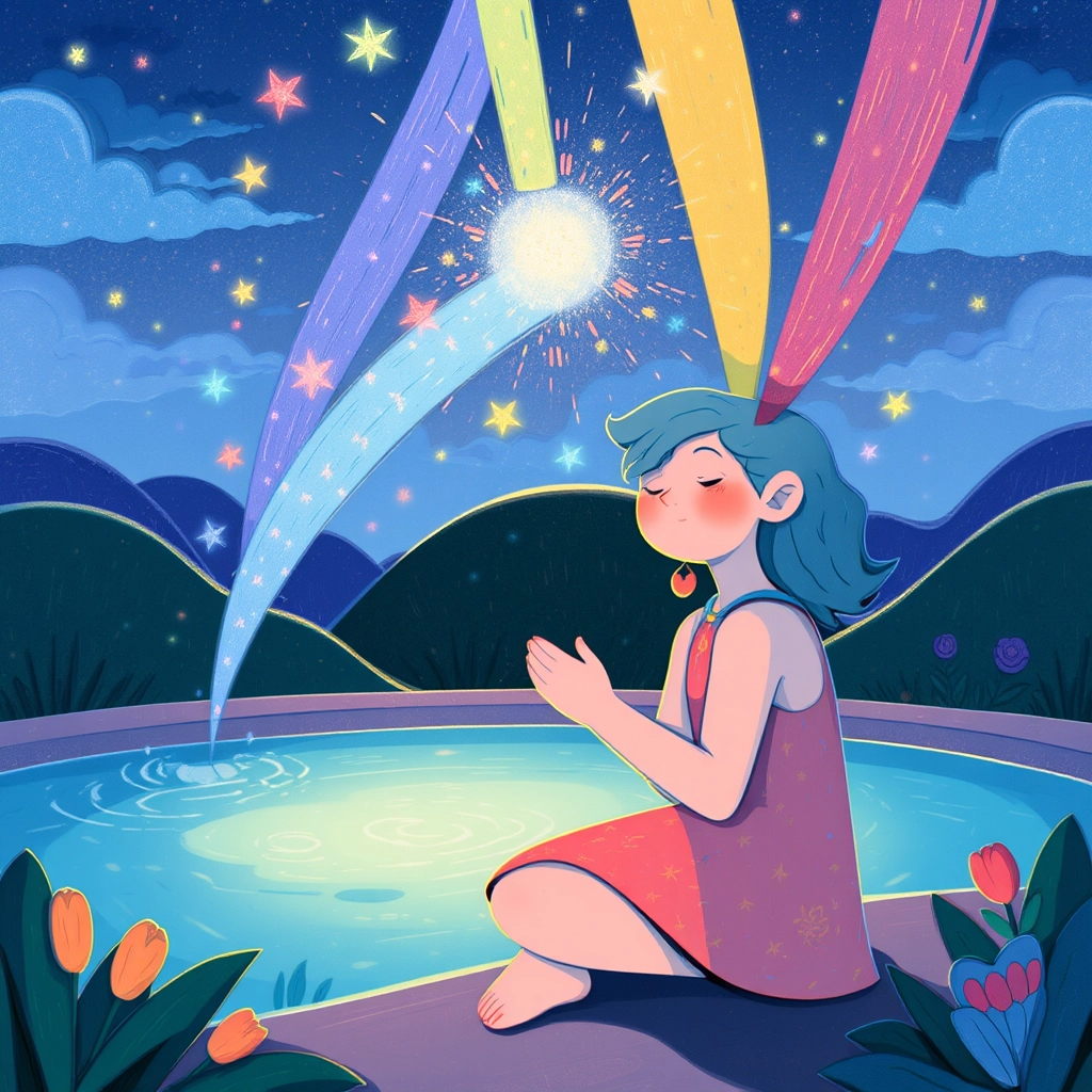 Zowie closed her eyes and wished for everyone in the world to have a day full of fun and friends. The pool sparkled and sent rays of light across the sky!